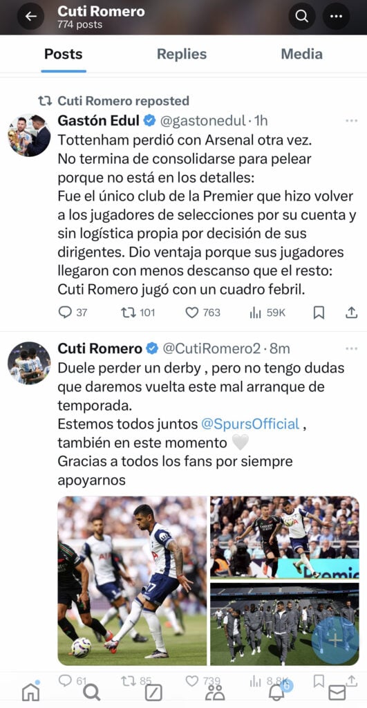 Edul wrote on X, which Romero retweeted, a post in Spanish that translated to: “Tottenham lost to Arsenal again.