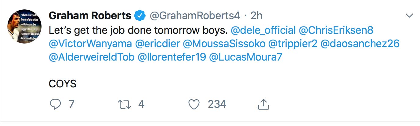 Roberts took to Twitter to say “Let’s get the job done tomorrow” to Christian Eriksen, Dele Alli, Victor Wanyma, Eric Dier, Moussa Sissoko, Kieran Trippier, Davinson Sanchez, Toby Alderweireld, Fernando Llorente and Lucas Moura.