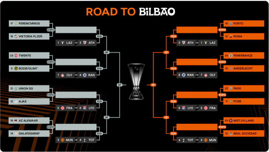 As shown in the official UEFA Europa League bracket, Tottenham have been paired with Man Utd for the next stage as a result of the two sides finishing in third and fourth places in the group stages.