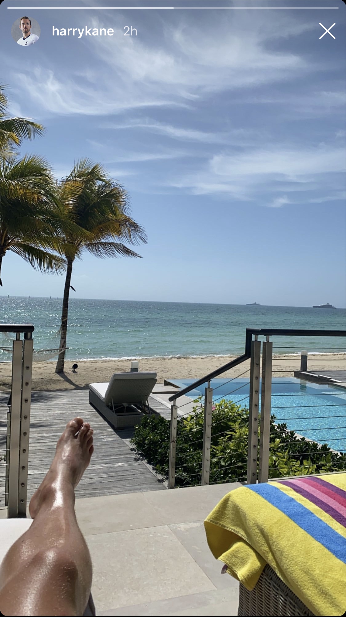 Kane posted a photo on his Instagram story of himself resting on a sun lounger next to a beach.