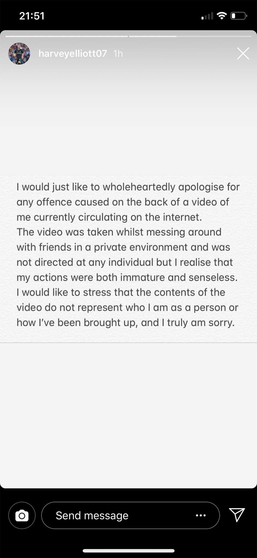 “The video was taken whilst messing around with friends in a private environment and was not directed at any individual but I realise that my actions were both immature and senseless.