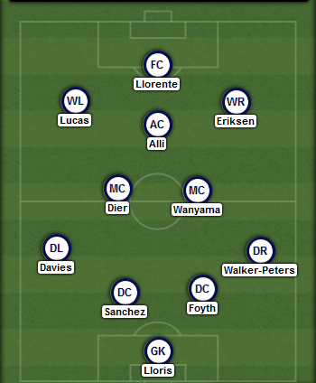 Eric Dier and Victor Wanyama hold down the fort in central midfield, while Lucas Moura, Dele Alli, and Eriksen sit behind Llorente up front.