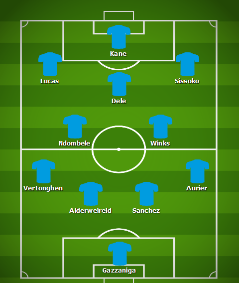 I believe that Gazzaniga will start in goal again, with a standard back four of Vertonghen, Alderweireld, Sanchez, and Aurier.