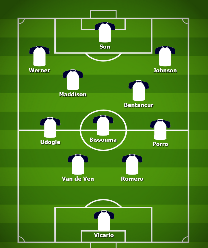 We believe that Guglielmo Vicario will start between the sticks for the Lilywhites, with Pedro Porro and Destiny Udogie remaining in the inverted full-back roles.
