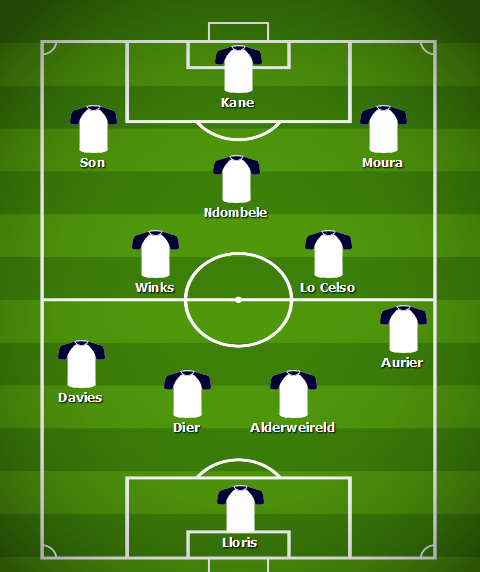 Ben Davies, Eric Dier, Toby Alderweireld, and Serge Aurier make up the defence, with captain Hugo Lloris between the sticks.