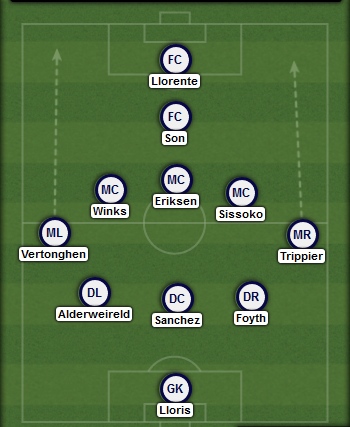 Up front, we see Fernando Llorente, Heung Min Son, and Eriksen just behind in the gap, pulling the strings.