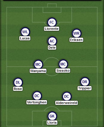 Dele Alli, Lucas Moura, and Christian Eriksen will line up in a three behind Fernando Llorente, who leads the line in the absence of Kane or Son.