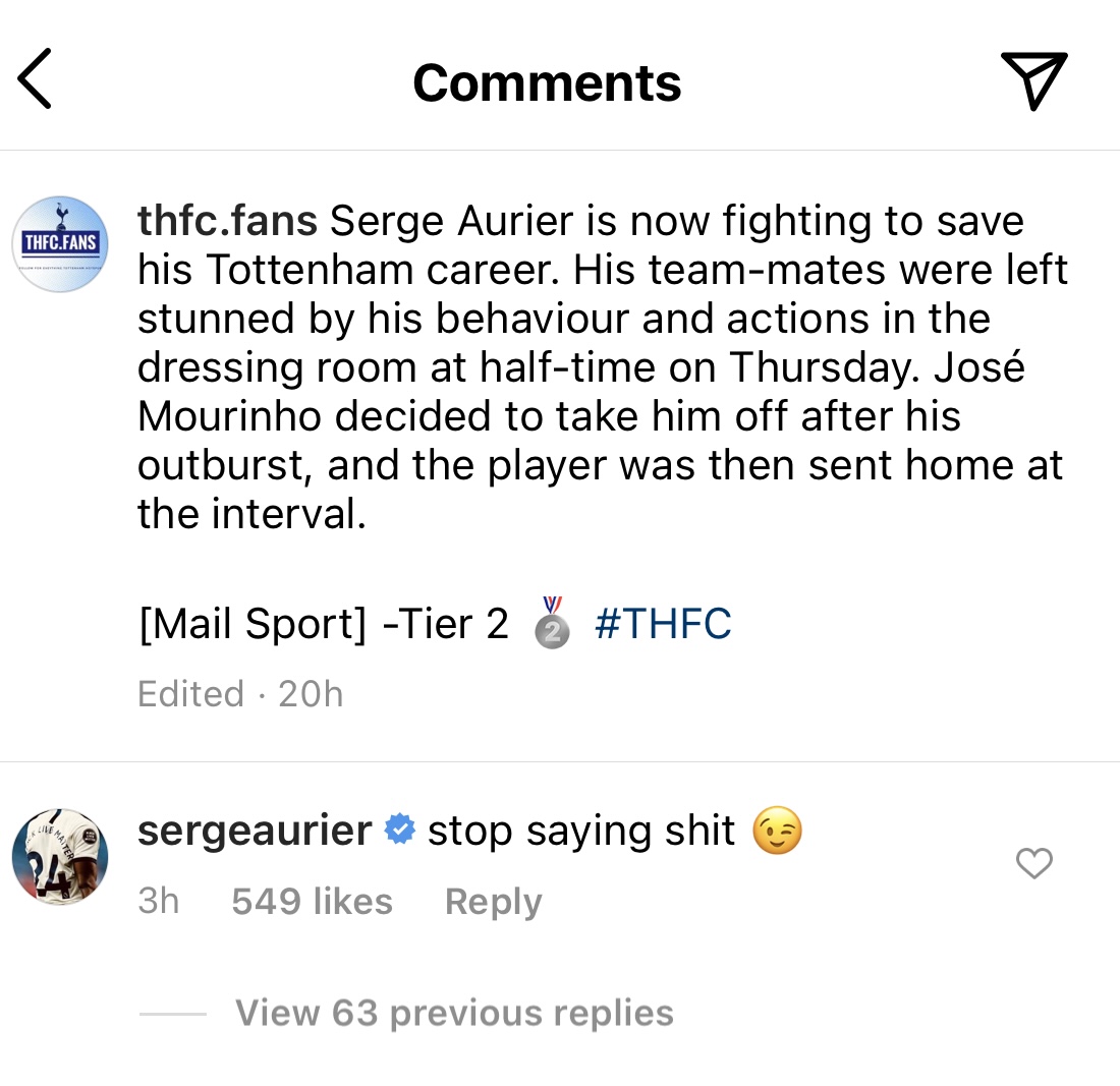 Serge Aurier has taken to Instagram to reply to a Tottenham Hotspur fan account who speculated about his career in North London..