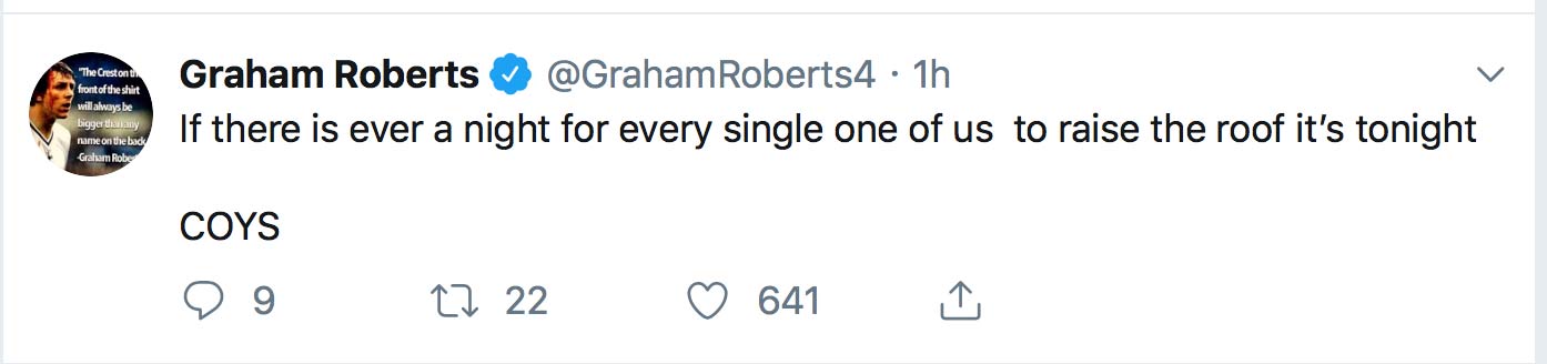 Tottenham Hotspur legend Graham Roberts has taken to Twitter to urge the fans attending tonight’s match against Ajax to create a formidable atmosphere.