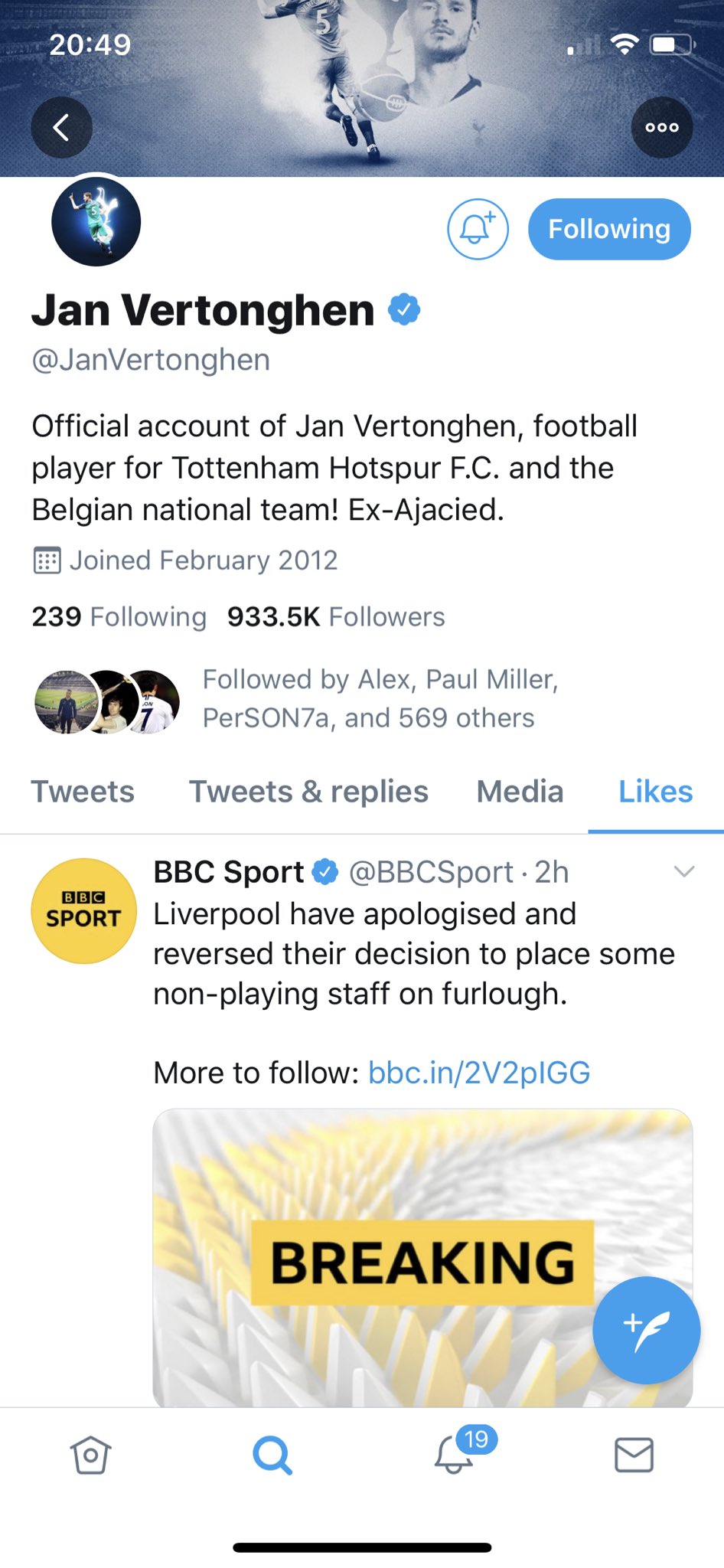 Tottenham Hotspur defender Jan Vertonghen took to Twitter earlier this evening when his official account ‘Liked’ a Tweet from the BBC Sport page which carried the story of Liverpool’s decision which has since been ‘Unliked’.