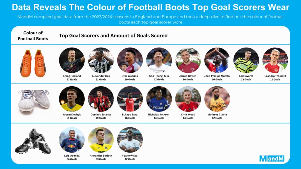 In the world of football boots, orange has become the new black. A deep dive into this season’s top goal scorers and their boot choices by MandM, the online retailer specialising in reduced-priced branded sportswear and fashion, reveals that almost a third of these players are lacing up in orange boots.